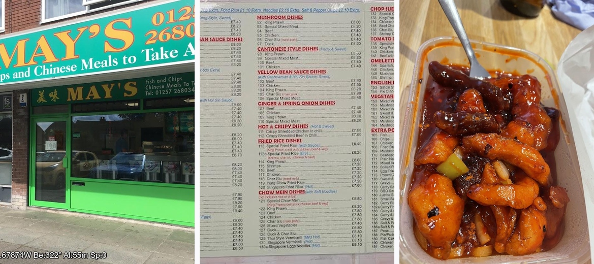 We were so impressed with our takeaway from Mays last night I felt compelled to write a review. The food was fantastic, portions just right, not too expensive and ready to collect promptly. Delivery not available but it’s straight forward to collect with plenty of parking and a cash machine right outside the takeaway. We will definitely return.